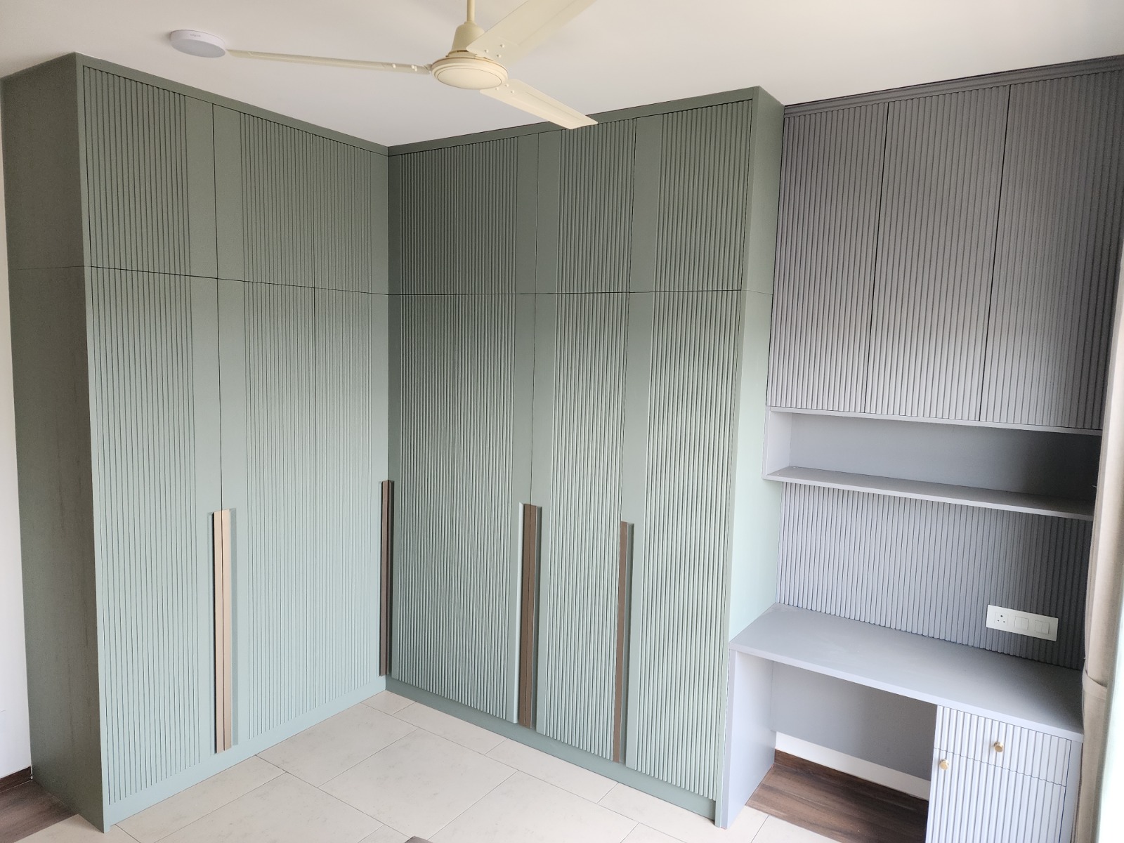 This 3BHK home was designed keeping in mind not just Simi’s preferences, but the comfort of her parents and her little niece, who’d be spending lots of time here. Each room was given its own unique mood — some playful, some serene, and some full of drama. The kitchen was custom-designed as a vibrant modular setup — both practical and packed with colour. We worked around a bold palette, steering clear of pastels and neutrals, and instead embraced deeper hues that brought out Simi’s fearless sense of style. From wardrobe shutters to accent walls and soft furnishings, every element was curated to celebrate her love for strong, expressive colours — without overwhelming the space.